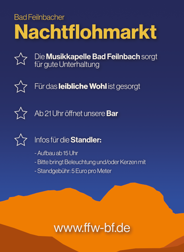 Am 27.6.25 ist es wieder soweit, wir veranstalten unseren traditionellen Nachtflohmarkt in der Bahnhofstraße in Bad Feilnbach. Der Markt beginnt um 17 Uhr, es darf ab 15 Uhr aufgebaut werden. Eine Platzbuchung/Reservierung ist NICHT möglich. Einfach kommen, sich seinen Platz aussuchen, Platz belegen und ab 15 Uhr aufbauen. Die Standgebühr beträgt 5 Euro je Meter. Für die Abendstunden bitte Beleuchtung oder Kerzen mitbringen. Für das leibliche Wohl und für Unterhaltung ist im Straßenfest gesorgt. Die Bar öffnet um 21 Uhr. Wir freuen uns auf Sie. Ihre freiwillige Feuerwehr Bad Feilnbach. Infotelefon 08066/8097